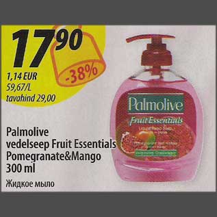 Toode palmolive vedelseep fruit essentials pomegranate&mango oli müügil allahindlusega Selveri poes ajavahemikul 05.08.2010 kuni 08.09.2010.