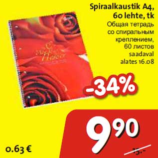 Toode spiraalkaustik a4 oli müügil allahindlusega Hüper Rimi ja Rimi poodides ajavahemikul 11.08.2010 kuni 24.08.2010.