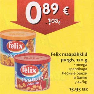Kaup felix maapähklid purgis oli müügil allahindlusega Hüper Rimi ja Rimi poodides ajavahemikul 19.01.2011 kuni 01.02.2011.