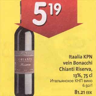 Kaup itaalia kpn vein bonacchi chianti riserva oli müügil allahindlusega Hüper Rimi ja Rimi poodides ajavahemikul 08.06.2011 kuni 28.06.2011.