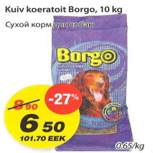 Kaup kuiv koeratoit borgo oli müügil allahindlusega Maxima poes ajavahemikul 02.09.2011 kuni 05.09.2011.