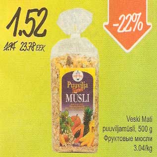 Kaup veski mati puuviljamüsli oli müügil allahindlusega Säästumarketi poes ajavahemikul 31.10.2011 kuni 06.11.2011.