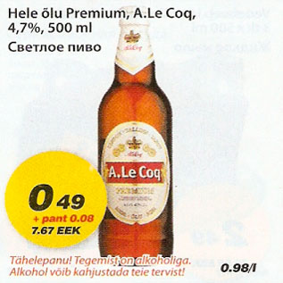 Kampaania periood: 22.11.2011 - 28.11.2011 Hind: 0.49€ Hele õlu Premium A.Le CoqKriisis.ee ei vastuta kommentaaride sisu eest. Autori arvamus võib kriisis.ee arvamusest erineda. Võimaluse korral jälgides kommentaare, kriisis.ee jätab endale õiguse kustutada neid põhjusi seletamata. Kui Teie olete sobimatu kommentaari märganud, palume meile sellest teatada.
