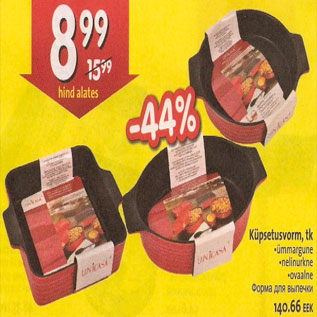 Toode küpsetusvorm oli müügil allahindlusega Hüper Rimi ja Rimi poodides ajavahemikul 04.01.2012 kuni 17.01.2012 hinnaga 8.99 eurot.