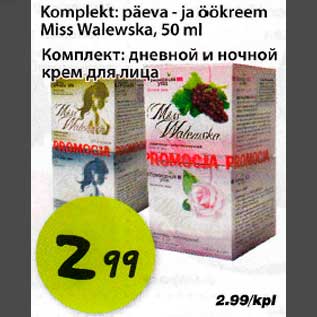 Kampaania periood: 13.03.2012 - 19.03.2012 Hind: 2.99€ Komplekt: päeva - ja öökreem Miss WaIewska,50 ml