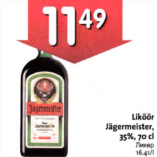 Kaup liköör jägermeister, 35%,7о cl oli müügil allahindlusega Hüper Rimi ja Rimi poodides ajavahemikul 28.03.2012 kuni 10.04.2012 hinnaga 11.49 eurot.
