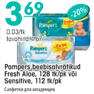 Kampaania periood: 05.04.2012 - 18.04.2012 Hind: 3.69€ Pampers beebisalvrätikud Fresh Aloe, 128tk/pk või Sensitive, 112tk/pk