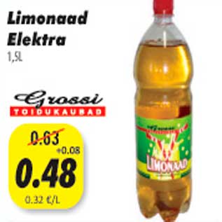 Kaup limonad elektra, 1,5l oli müügil allahindlusega Grossi poes ajavahemikul 06.04.2012 kuni 12.04.2012 hinnaga 0.48 eurot.