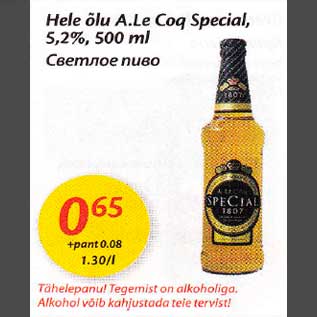 Kaup hele õlu a,le coq special, 5,2%, 500ml oli müügil allahindlusega Maxima poes ajavahemikul 24.07.2012 kuni 30.07.2012 hinnaga 0.65 eurot.