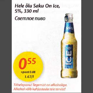 Kaup hele õlu saku on lce, 5%, 330 ml oli müügil allahindlusega Maxima poes ajavahemikul 31.07.2012 kuni 06.08.2012 hinnaga 0.55 eurot.