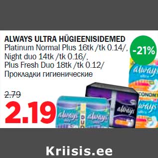 Toode always ultra hügieenisidemed platinum normal plus 16tk /tk 0.14/, night duo 14tk /tk 0.16/,plus fresh duo 18tk /tk 0.12/ oli müügil allahindlusega Maksimarketi ja Konsumi poodides ajavahemikul 14.11.2012 kuni 18.12.2012 hinnaga 2.19 eurot.