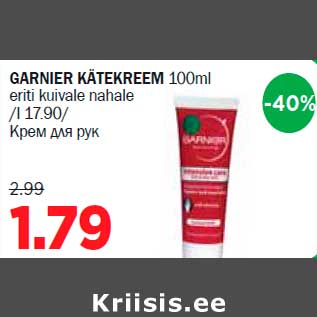 Toode garnier kätekreem 100ml eriti kuivale nahale oli müügil allahindlusega Maksimarketi ja Konsumi poodides ajavahemikul 14.11.2012 kuni 18.12.2012 hinnaga 1.79 eurot.