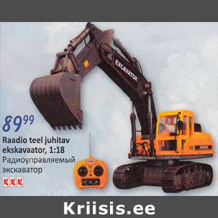 Toode radio teel juhitav ekskavaator,1:18 oli müügil allahindlusega Maxima poes ajavahemikul 23.11.2012 kuni 12.12.2012 hinnaga 89.99 eurot.