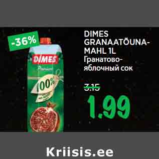 Kaup dimes granaatõunamahl 1l oli müügil allahindlusega Maksimarketi poes ajavahemikul 30.01.2013 kuni 11.02.2013 hinnaga 1.99 eurot.