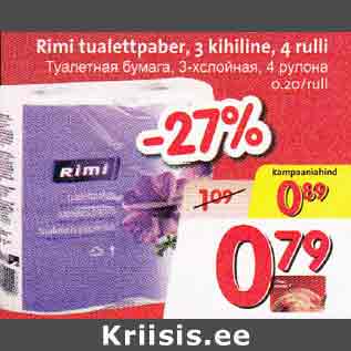 Toode rimi tualettpaber, 3 kihiline, 4 rulli oli müügil allahindlusega Hüper Rimi ja Rimi poodides ajavahemikul 06.03.2013 kuni 12.03.2013 hinnaga 0.79 eurot.