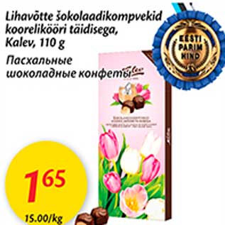 Kaup lihavõtte šokolaadikompvekid koorelikööri täidisega, kalev, 110g oli müügil allahindlusega Maxima poes ajavahemikul 26.03.2013 kuni 01.04.2013 hinnaga 1.65 eurot.