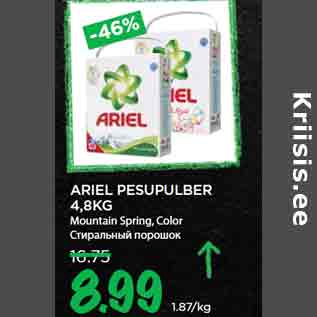 Toode ariel pesupulber 4,8kg mountain spring, color oli müügil allahindlusega Maksimarketi, Konsumi ja AjaO poodides ajavahemikul 29.05.2013 kuni 10.06.2013 hinnaga 8.99 eurot.