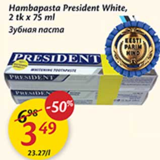 Toode hambapasta president white, 2 tk x 75 ml oli müügil allahindlusega Maxima poes ajavahemikul 15.10.2013 kuni 21.10.2013 hinnaga 3.49 eurot.