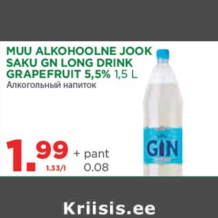 Kaup muu alkohoolne jook saku gn long drink grapefruit 5,5% 1,5 l oli müügil allahindlusega Maksimarketi, Konsumi ja AjaO poodides ajavahemikul 13.11.2013 kuni 25.11.2013 hinnaga 1.99 eurot.