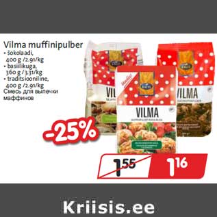 Kampaania periood: 20.11.2013 - 03.12.2013 Hind: 1.16€ Vilma muffinipulber• šokolaadi, 400 g /2.91/kg • basiilikuga, 360 g /3.31/kg • traditsiooniline, 400 g /2.91/kg
