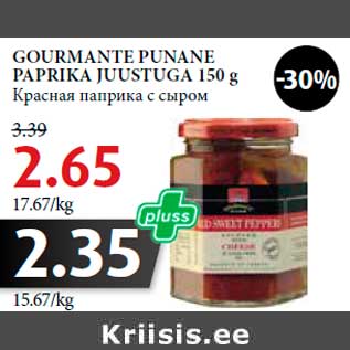 Kaup gourmante punane paprika juustuga 150 g oli müügil allahindlusega Maksimarketi poes ajavahemikul 18.12.2013 kuni 01.01.2014 hinnaga 2.35 eurot.