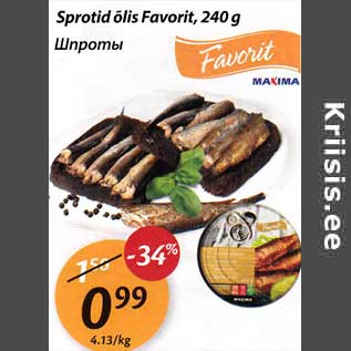 Kaup sprotid õlis favorit, 240 g oli müügil allahindlusega Maxima poes ajavahemikul 23.01.2014 kuni 27.01.2014 hinnaga 0.99 eurot.