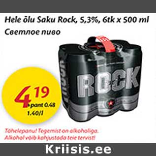 Kaup hele õlu saku rock oli müügil allahindlusega Maxima poes ajavahemikul 28.01.2014 kuni 03.02.2014 hinnaga 4.19 eurot.