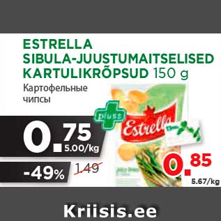 Kaup estrella sibula-juustumaitselised kartulikrõpsud 150 g oli müügil allahindlusega Maksimarketi ja Konsumi poodides ajavahemikul 02.04.2014 kuni 15.04.2014 hinnaga 0.75 eurot.