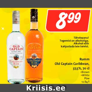 Kampaania periood: 02.04.2014 - 08.04.2014 Hind: 8.99€ Rumm Old Captain Caribbean37,5%, 70 cl •Brown •White Kriisis.ee ei vastuta kommentaaride sisu eest. Autori arvamus võib kriisis.ee arvamusest erineda. Võimaluse korral jälgides kommentaare, kriisis.ee jätab endale õiguse kustutada neid põhjusi seletamata. Kui Teie olete sobimatu kommentaari märganud, palume meile sellest teatada.