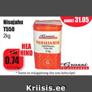 Kampaania periood: 31.05.2014 Hind: 0.74€ Nisujahu T550 2kg* Tootel on müügipiirang ühe ostu kohta 6pk!