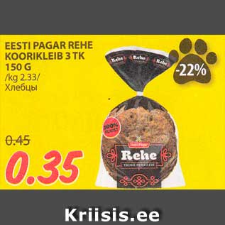 Kaup eesti pagar rehe koorikleib 3 tk 150 g oli müügil allahindlusega Maksimarketi ja Konsumi poodides ajavahemikul 28.05.2014 kuni 10.06.2014 hinnaga 0.35 eurot.