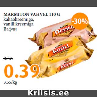 Kaup marmiton vahvel 110 g oli müügil allahindlusega Maksimarketi ja Konsumi poodides ajavahemikul 26.06.2014 kuni 01.07.2014 hinnaga 0.39 eurot.