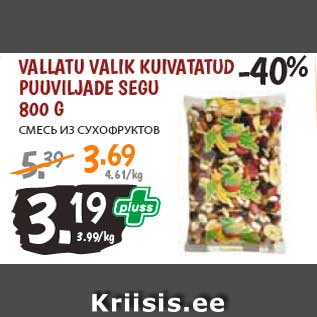 Kaup vallatu valik kuivatatud puuviljade segu 800 g oli müügil allahindlusega Maksimarketi ja Konsumi poodides ajavahemikul 02.07.2014 kuni 15.07.2014 hinnaga 3.19 eurot.