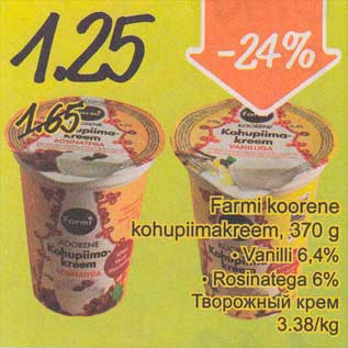 Kampaania periood: 07.07.2014 - 13.07.2014 Hind: 1.25€ farmi koorene kohupiimakreem370 g .Vanilli 6,4% .Rosinatega 6%