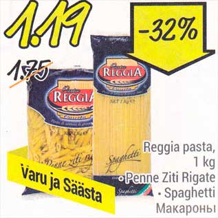 Kampaania periood: 10.11.2014 - 16.11.2014 Hind: 1.19€ Reggia pasta, 1 kg.Penne Ziti Rigate .Spaghetti
