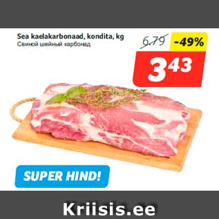 Kaup sea kaelakarbonaad, kondita, kg oli müügil allahindlusega Hüper Rimi ja Rimi poodides ajavahemikul 18.11.2014 kuni 24.11.2014 hinnaga 3.43 eurot.