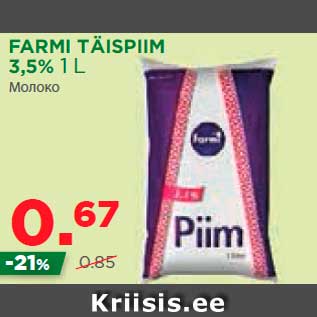 Kaup farmi täispiim oli müügil allahindlusega Maksimarketi ja Konsumi poodides ajavahemikul 19.11.2014 kuni 25.11.2014 hinnaga 0.67 eurot.