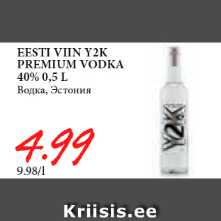 Kaup eesti viin y2k premium vodka oli müügil allahindlusega Maksimarketi, Konsumi ja AjaO poodides ajavahemikul 17.12.2014 kuni 06.01.2015 hinnaga 4.99 eurot.