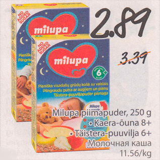 Kampaania periood: 05.01.2015 - 11.01.2015 Hind: 2.89€ Milupa piimapuder, 250 g.Kaera-õuna 8+ .Täistera-puuvilja 6+