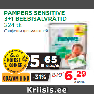Toode pampers sensitive 3+1 beebisalvrätid 224 tk oli müügil allahindlusega Maksimarketi ja Konsumi poodides ajavahemikul 07.01.2015 kuni 20.01.2015 hinnaga 5.65 eurot.