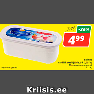 Kampaania periood: 20.01.2015 - 26.01.2015 Hind: 4.99€ Balbino vanilli kokteilijäätis, 5 l, 2,25/kgv.a Postimaja Rimi