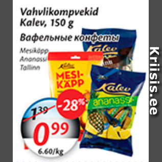 Kampaania periood: 03.02.2015 - 09.02.2015 Hind: 0.99€ Vahvlikompvekid Kalev, 150 gMesikäpp, Ananassi, Tallinn
