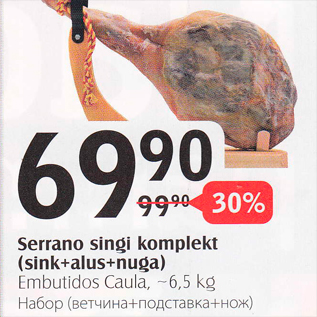 Kampaania periood: 24.02.2015 - 02.03.2015 Hind: 69.90€ Serrano singi komplekt (aink+alus+nuga)Embutidos Caula, ~6,5kg