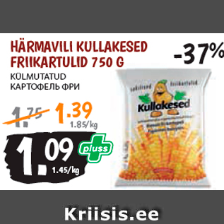 Kaup härmavili kullakesed friikartulid 750 g oli müügil allahindlusega Maksimarketi, Konsumi ja AjaO poodides ajavahemikul 04.03.2015 kuni 17.03.2015 hinnaga 1.09 eurot.