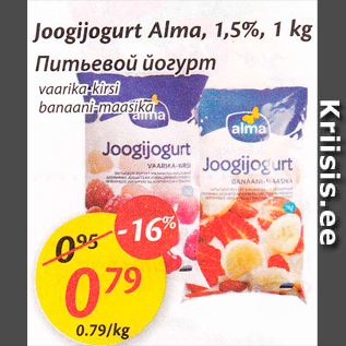 Kampaania periood: 10.03.2015 - 16.03.2015 Hind: 0.79€ Joogijogurt Alma1,5%, 1 kg, vaarika kirsi, banaani-maasika