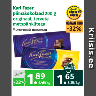 Kampaania periood: 18.03.2015 - 31.03.2015 Hind: 1.65€ Karl Fazer piimašokolaad200 g, originaal, tervete metspähklitega