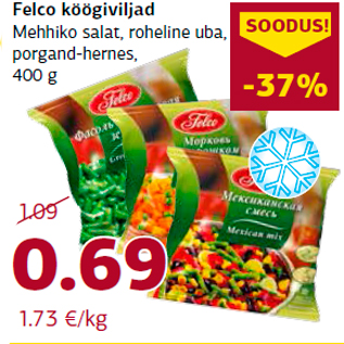 Kampaania periood: 07.05.2015 - 17.05.2015 Hind: 0.69€ Felco köögiviljadMehhiko salat, roheline uba, porgand-hernes, 400 g