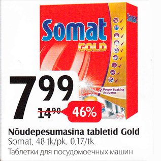 Toode nõudepesumasina tabletid gold oli müügil allahindlusega Selveri poes ajavahemikul 12.05.2015 kuni 18.05.2015 hinnaga 7.99 eurot.