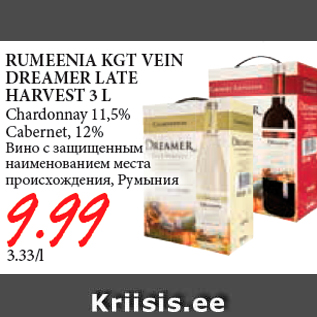 Kaup rumeenia kgt vein dreamer late harvest 3 l oli müügil allahindlusega Maksimarketi, Konsumi ja AjaO poodides ajavahemikul 17.06.2015 kuni 30.06.2015 hinnaga 9.99 eurot.