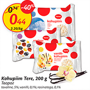 Kampaania periood: 30.06.2015 - 06.07.2015 Hind: 0.44€ Kohupiim Tere, 200 gtavaline, 5%, vanilli, 0,1%, rosinatega, 0,1%